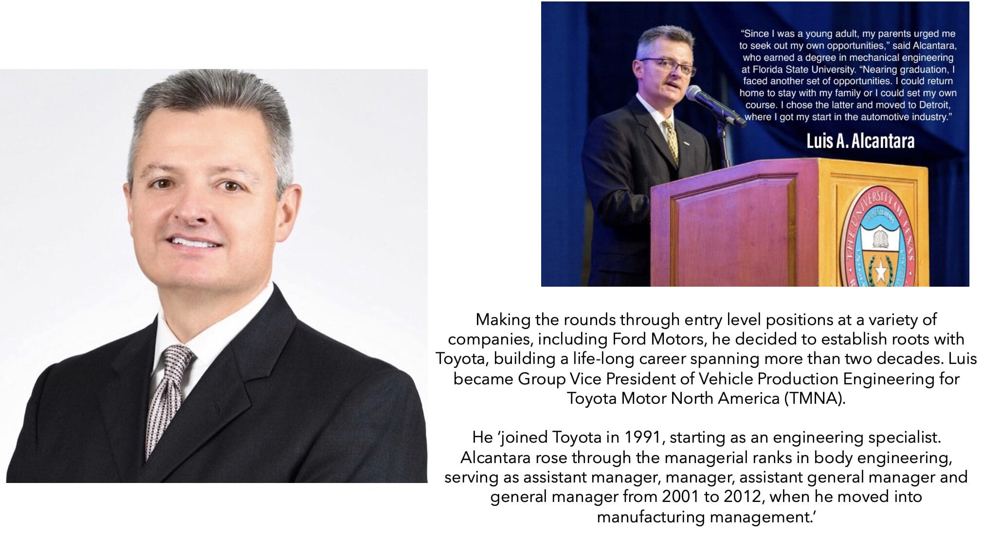 Luis had a 28-year career at Toyota Motor North America, work that stands as testament to what talent can achieve when given opportunity. Starting as an engineering specialist in 1991, Luis steadily climbed through the ranks of body engineering, from assistant manager to his final position as Group Vice President of Vehicle Production Engineering. In this role, he shouldered immense responsibility, overseeing new vehicle introductions across Toyota’s North American assembly plants and leading a team of more than 800 professionals. His work touched every aspect of production, from process planning and equipment procurement to construction, installation, and safety protocols. With each promotion, Luis forged not just personal achievement but solidly demonstrated what is possible for Latinos to accomplish in corporate America.